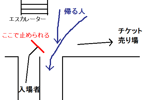 入り口につながる列は左右に分かれているのですが、チケット売り場はドアを入って右方向。それなのになぜか入場の列が左なもので、出てくる人とクロスしてしまい、いちいちスタッフさんに止められます。